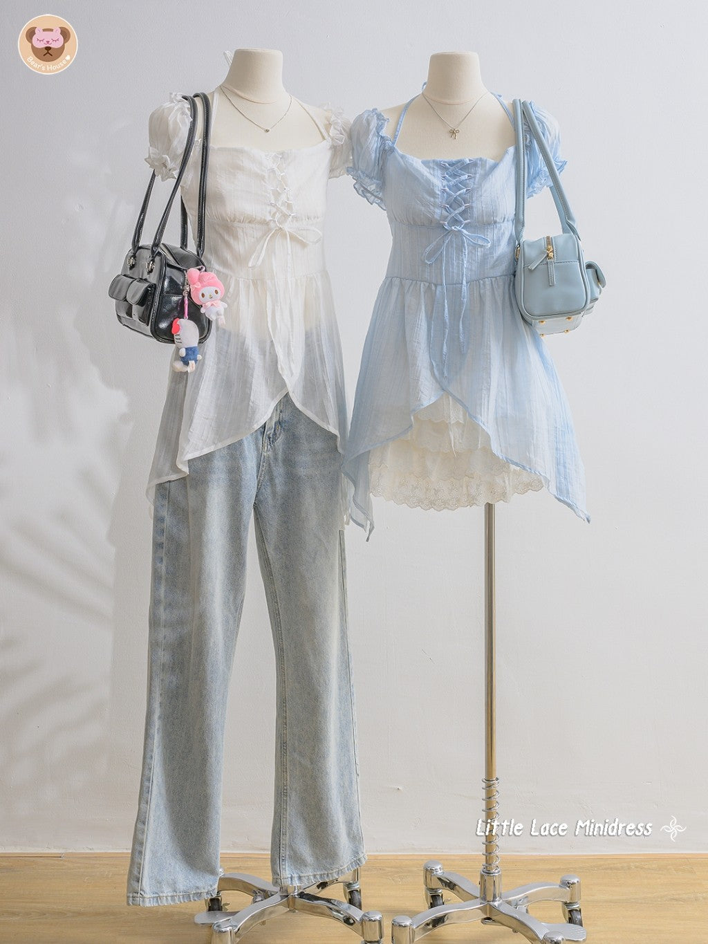 Little Lace Minidress มินิเดรสเเขนตุ๊กตา ตัวยาว ดีเทลมีเชือกผูกคอ ด้านหลังสม็อค