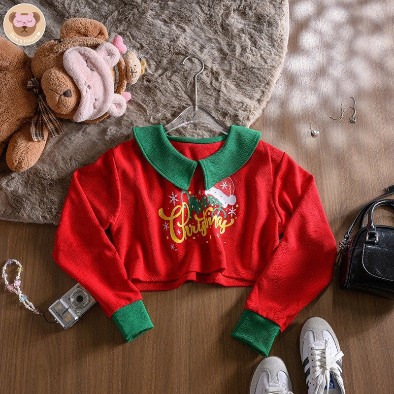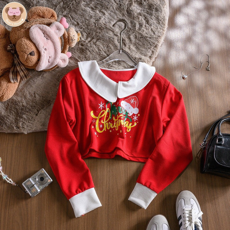 Merry Christmas Crop เสื้อครอปเเขนยาว คอบัว สกรีนลาย ผ้าวูลเวฟ ***ไม่รวมกระโปรง***