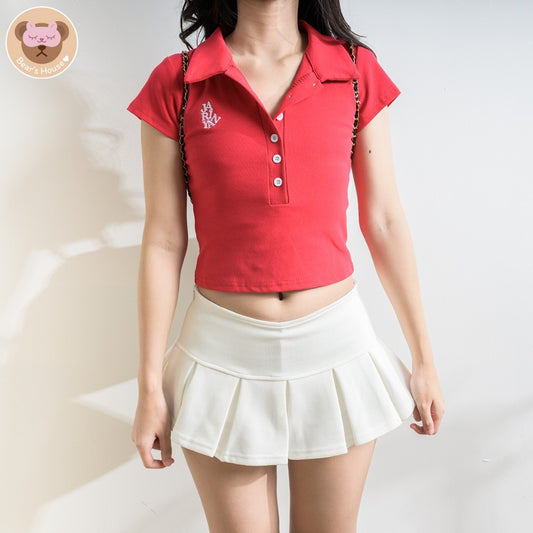 Gangnam Skirt กระโปรงพลีทสั้น เเต่งขอบลูกไม้ งานป้าย