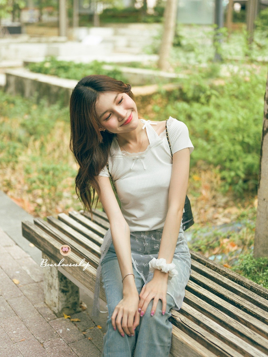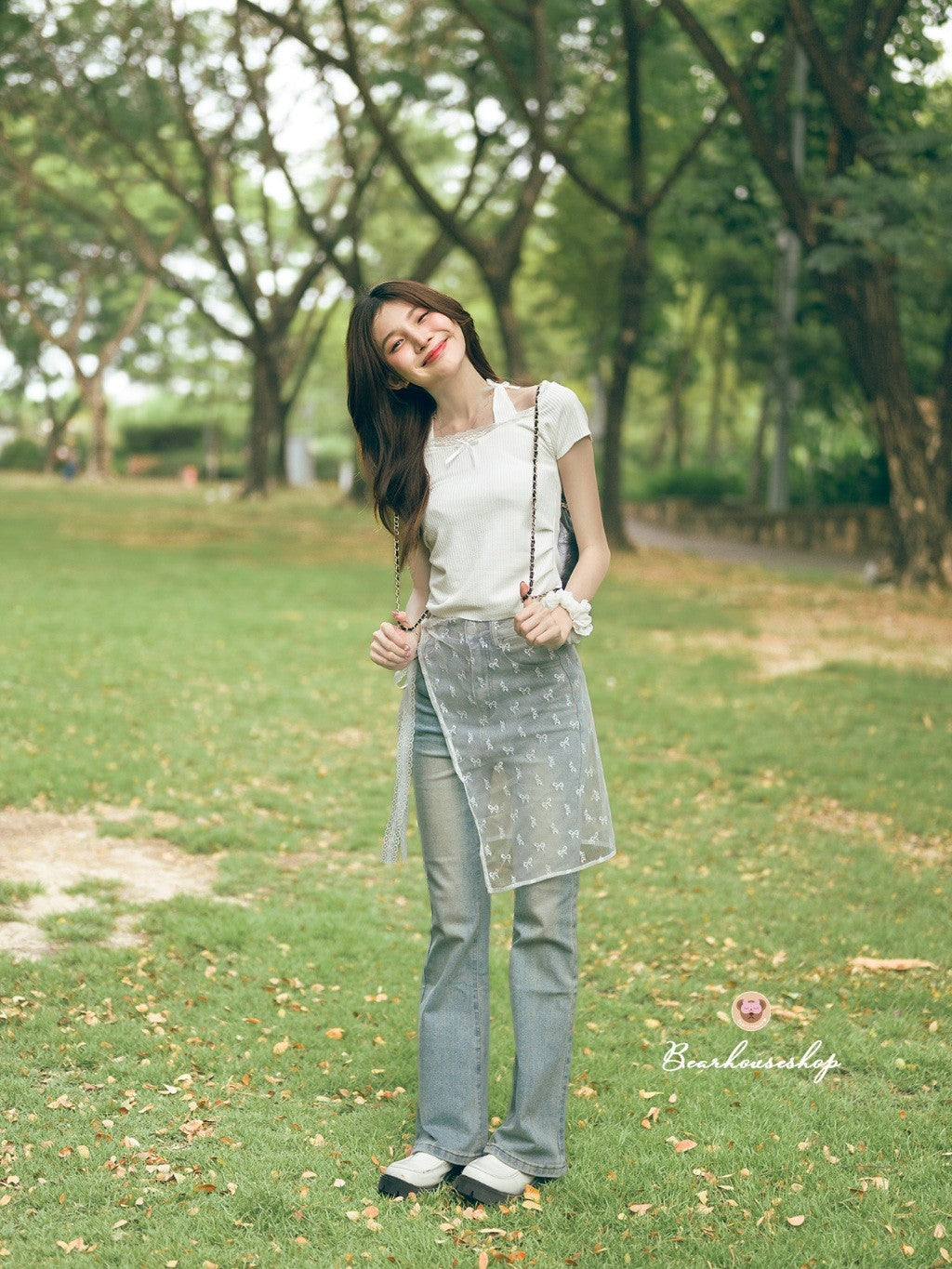 This crop top has short sleeves and delicate lace trim. A bow tie at the neck and ribbon details add a feminine touch, and it can also be worn off-shoulder. Made of stretchy ribbed fabric, it's comfortable and doesn't overheat. Plus, it doesn't require ironing - just wash, dry, and wear. It pairs perfectly with jeans or skirts. Mesh Waist Tie sold separately.