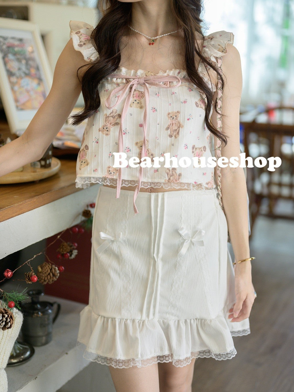 The Bony Skirt is a short skirt made of bark cloth, embellished with a ruffle detail. It is adorned with a delicate lace edge and a crisp white ribbon, adding intricate details to this piece.