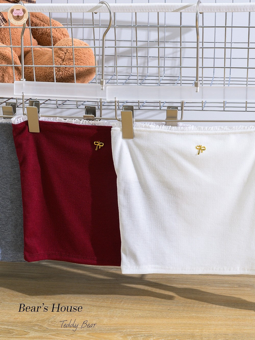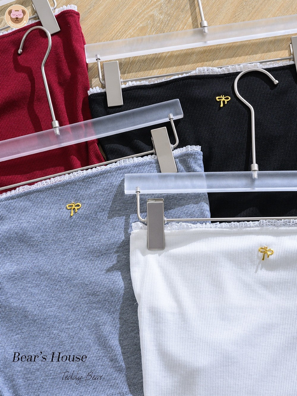 The Camella Top: a strapless blouse made of slit fabric, adorned with lace and a playful bow brooch. This versatile piece can be paired with either pants or skirts to create a fun and stylish look.