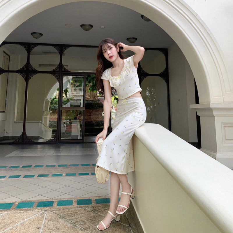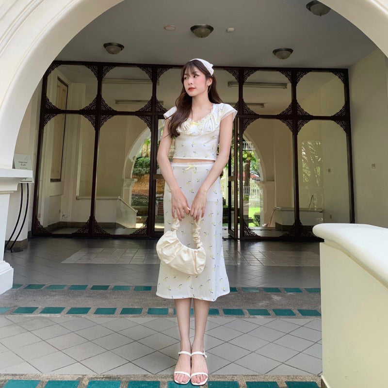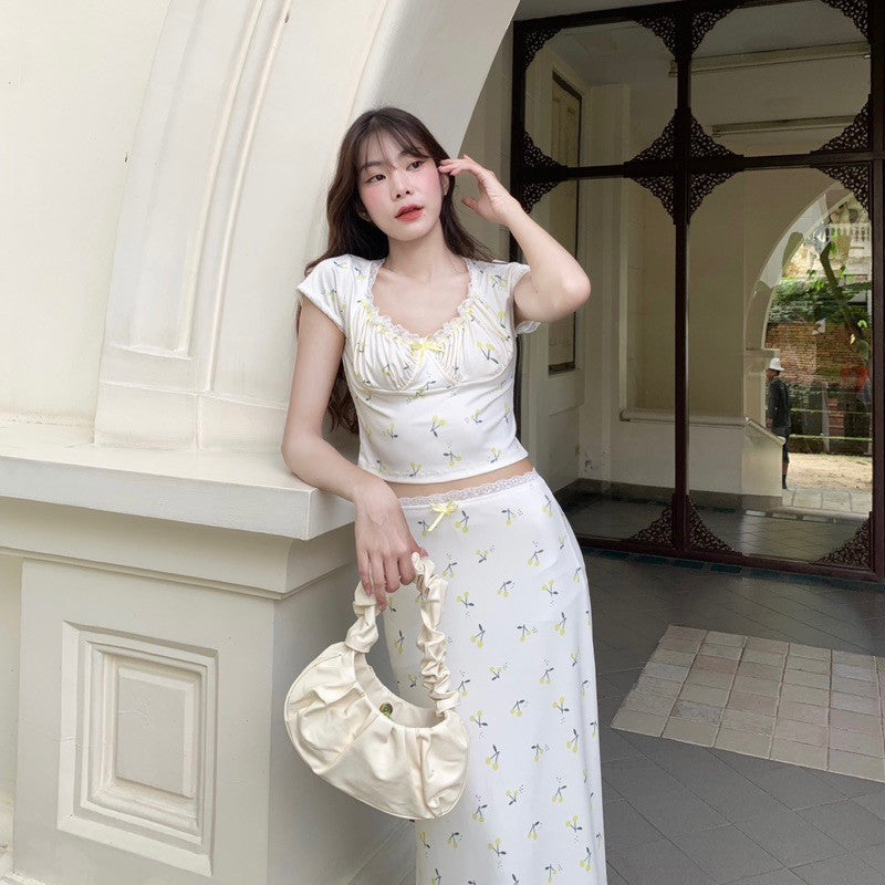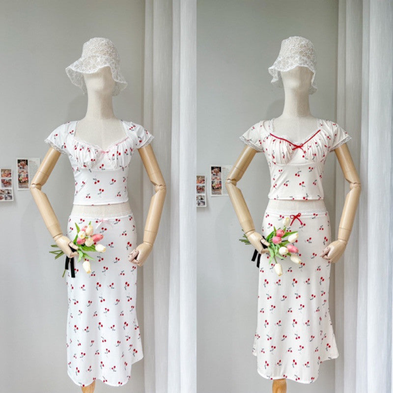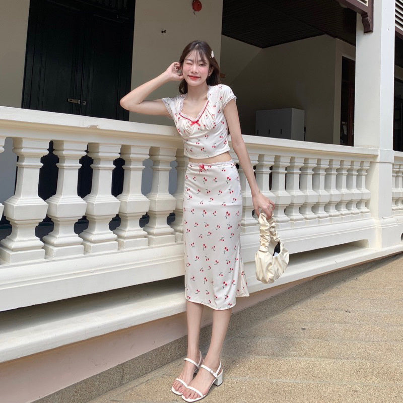 Get ready to turn heads in the Cherry Set! This adorable matching set includes a short-sleeved shirt and a long skirt, both adorned with delicate lace edges and a fun cherry print. The stretch fabric allows for comfortable wear and the option to mix and match. Perfect for a playful photo session with your favourite bouquet. Embrace the cuteness overload. 💕