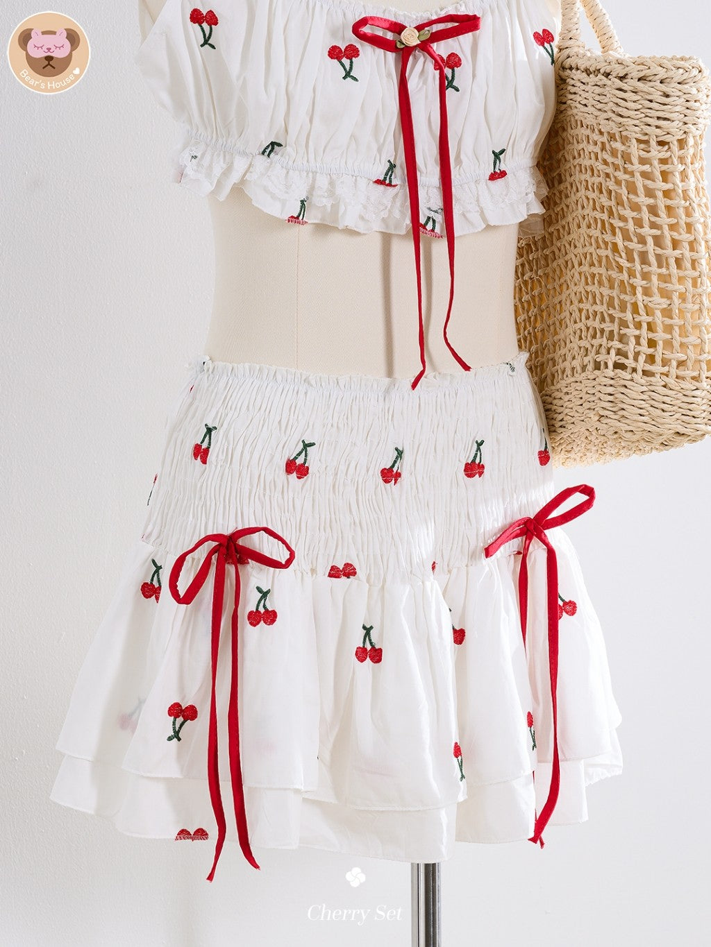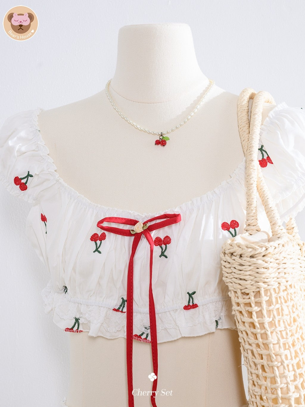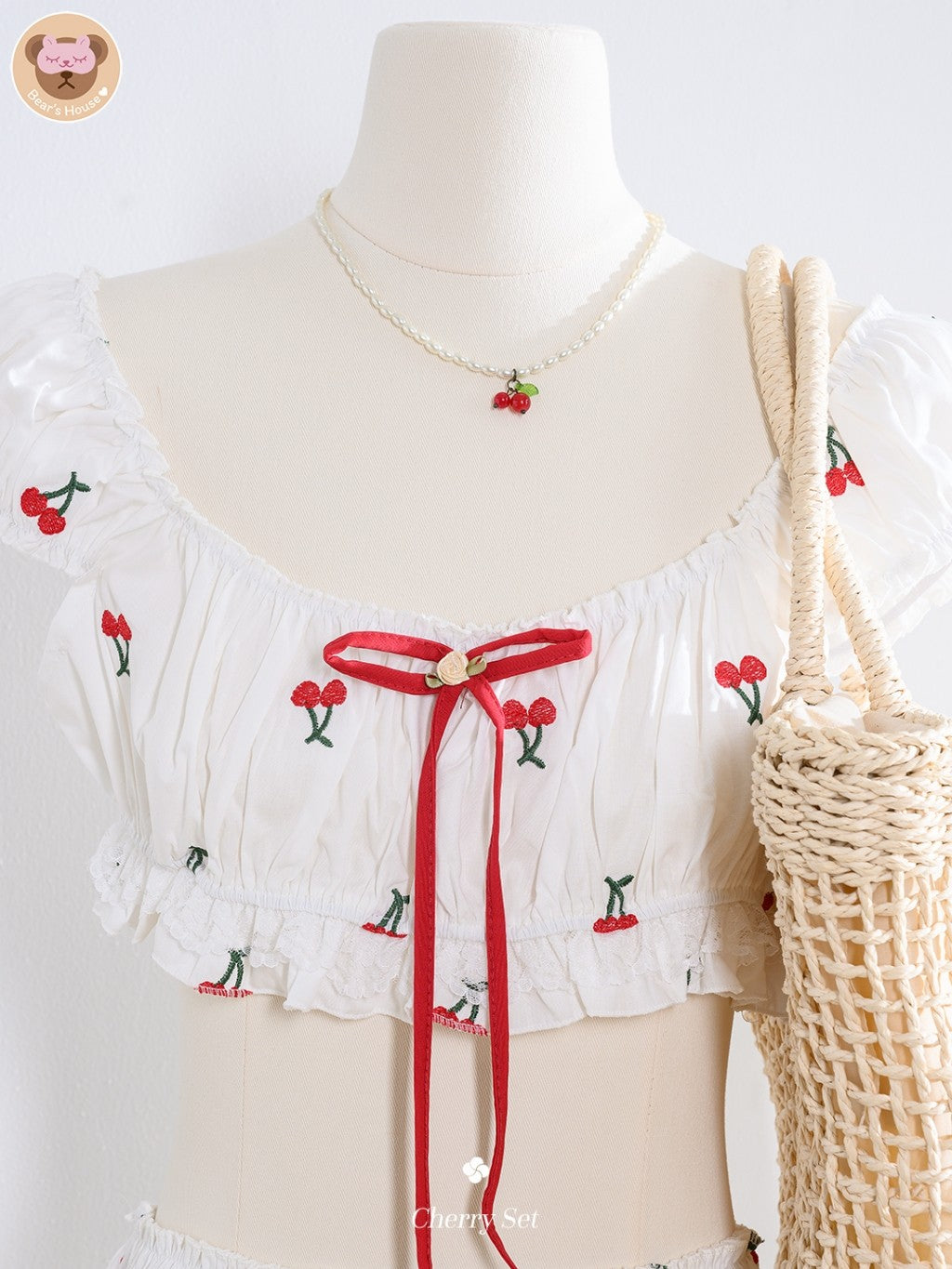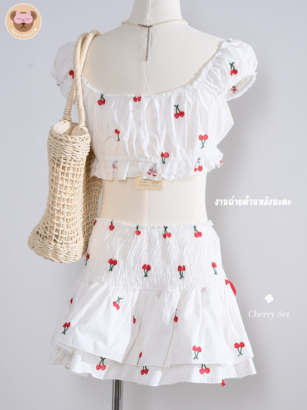 Cherry Set 🍒งานเซ็ท 2 ชิ้น เสื้อครอปจิ๋ว ปักลายเชอร์ กางเกงเอวสม็อค