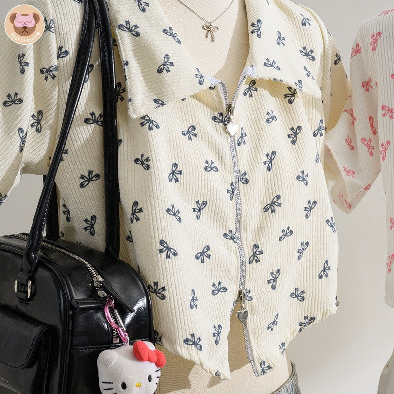 ผ้าลูกฟูกพิมพ์ลายโบว์ ดีเทลปลายโค้ง