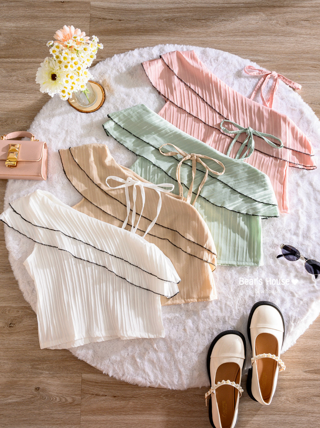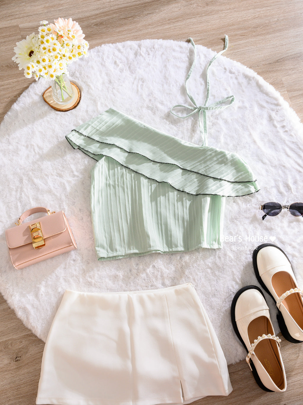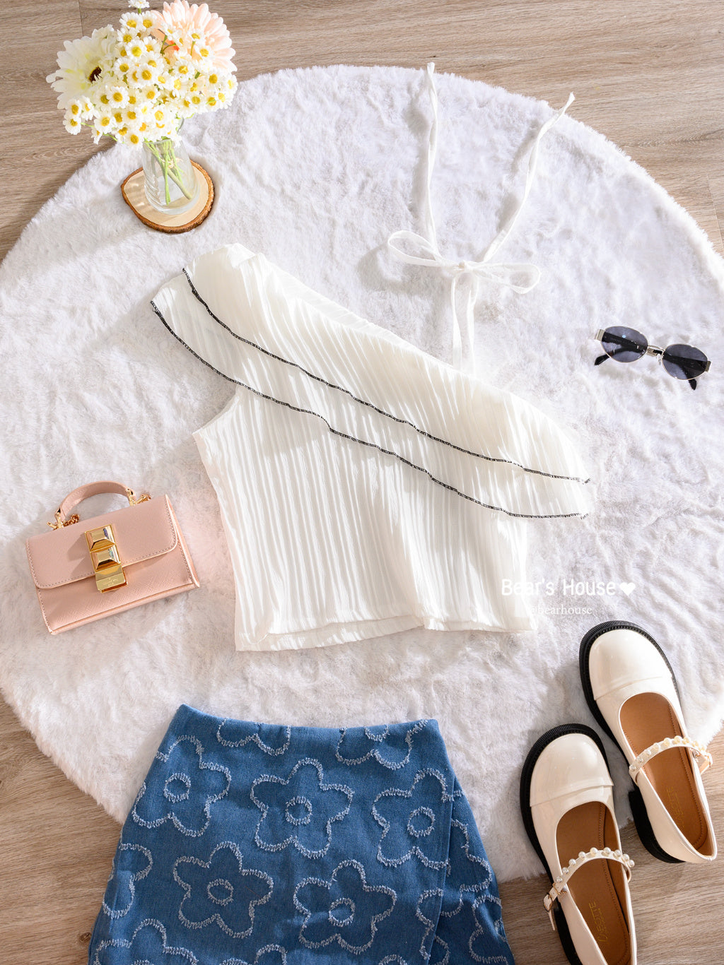 The Della Crop is a 2-layer ruffled shirt with an off-the-shoulder top that will make you feel cute and stylish. The elastic under the armpits ensures a comfortable fit, while the dobby fabric adds a unique texture. Perfect for cafe lovers, this top is a must-have for your wardrobe. Don't wait, get it now! ❤️