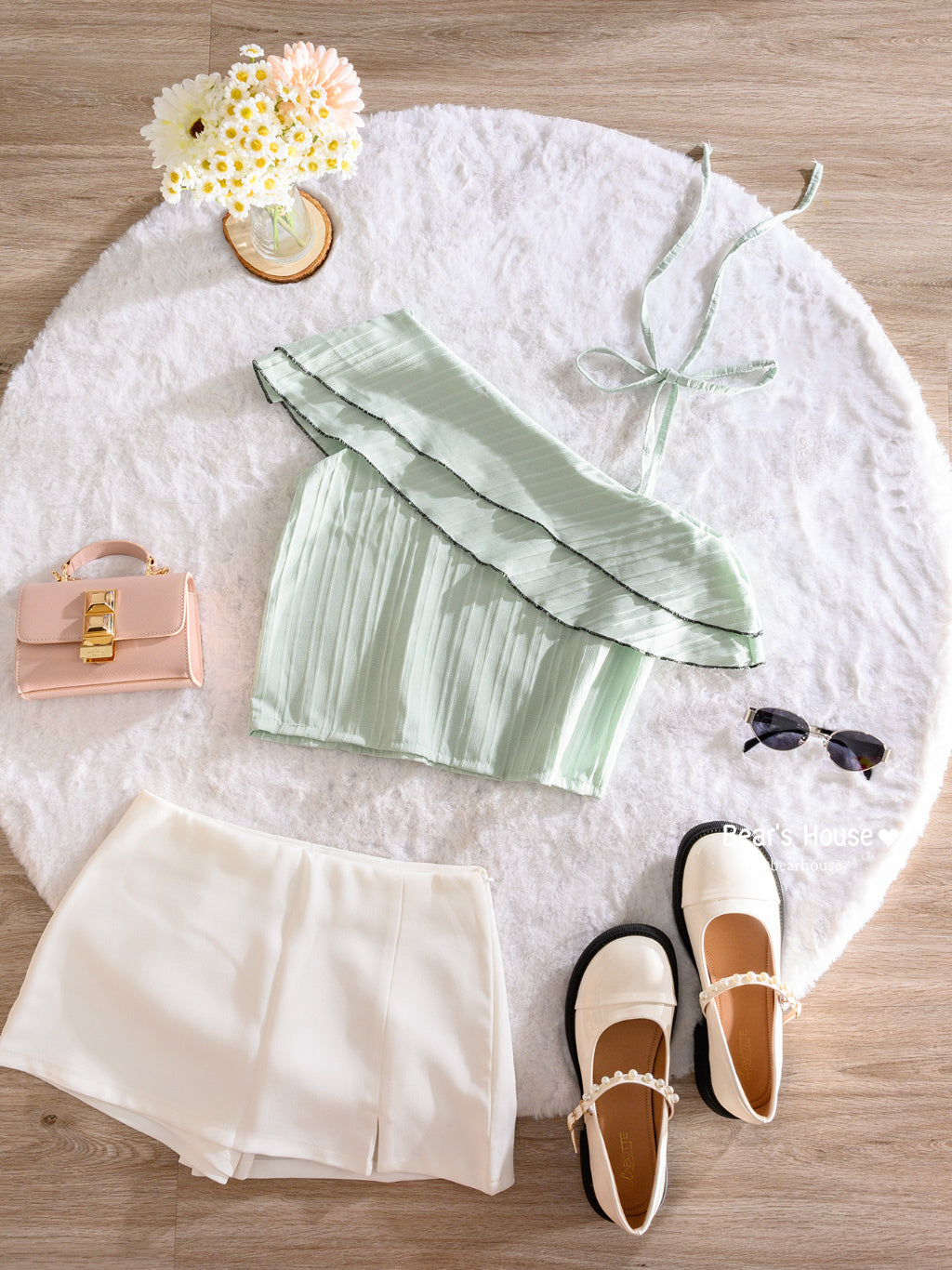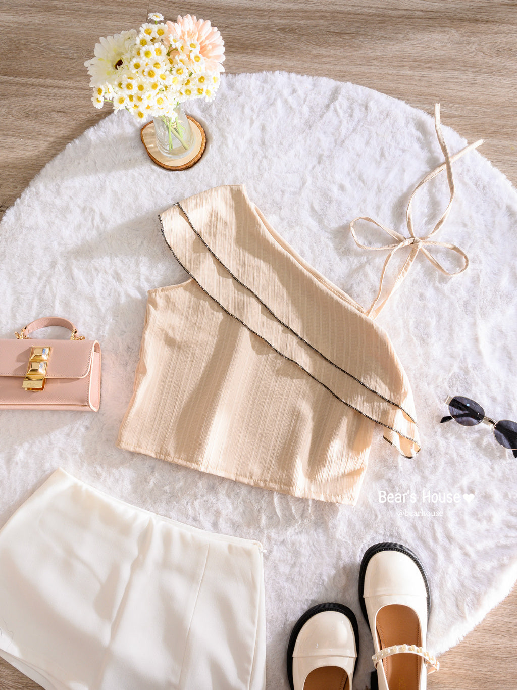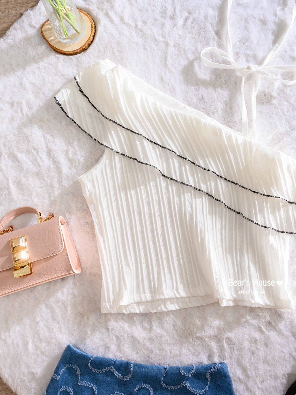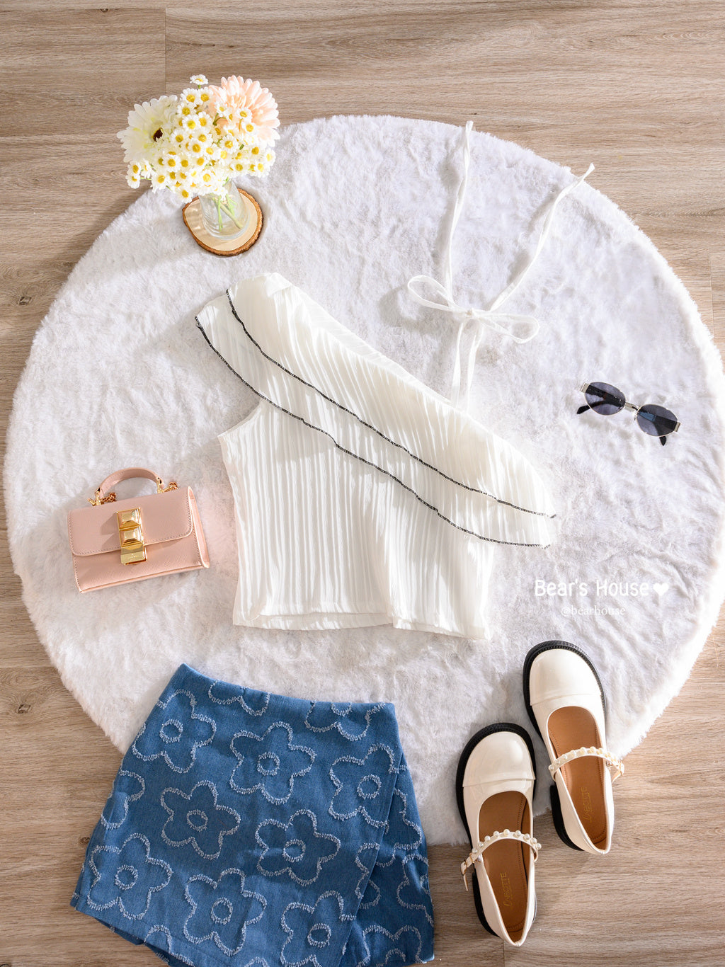 The Della Crop is a 2-layer ruffled shirt with an off-the-shoulder top that will make you feel cute and stylish. The elastic under the armpits ensures a comfortable fit, while the dobby fabric adds a unique texture. Perfect for cafe lovers, this top is a must-have for your wardrobe. Don't wait, get it now! ❤️
