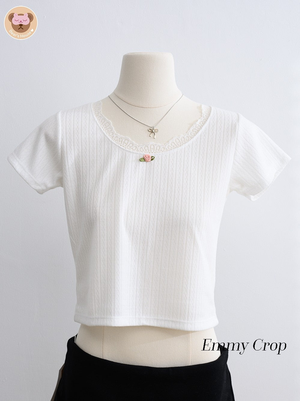 Emmy Crop t-shirt with square neckline, featuring playful pink roses and charming lace accents. The perfect blend of simplicity and cuteness, easily paired with skirts or pants.