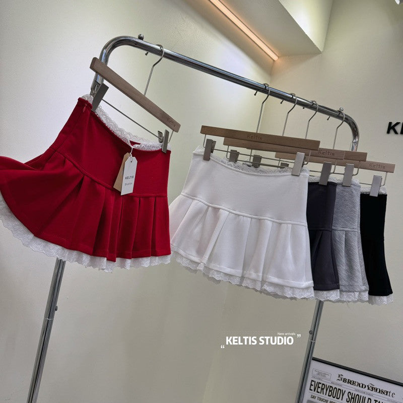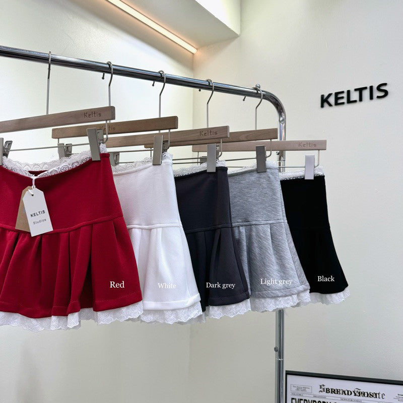 Gangnam Skirt กระโปรงพลีทสั้น เเต่งขอบลูกไม้