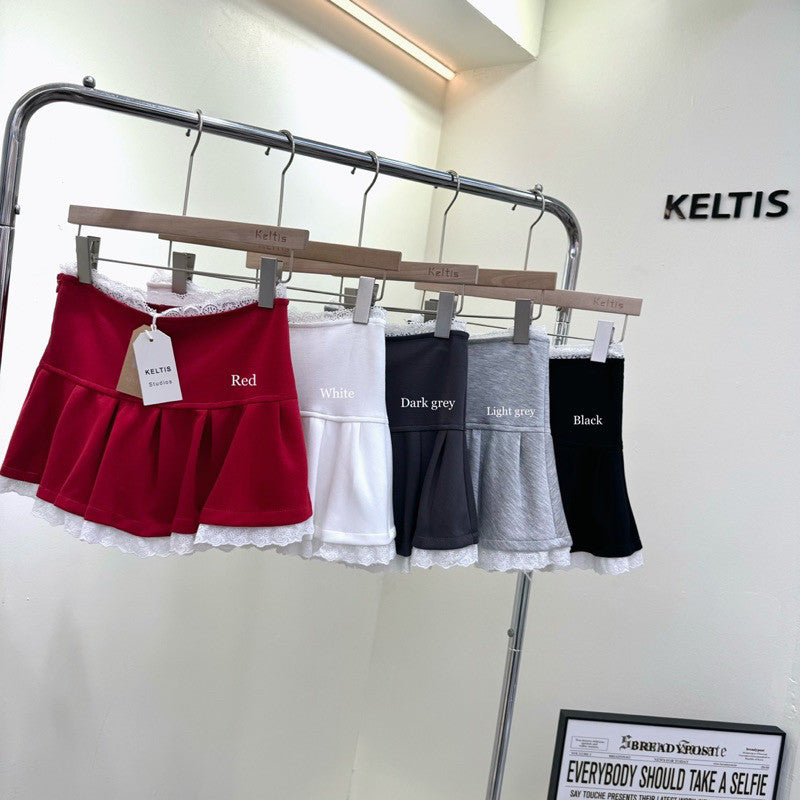 Gangnam Skirt กระโปรงพลีทสั้น เเต่งขอบลูกไม้ งานป้าย
