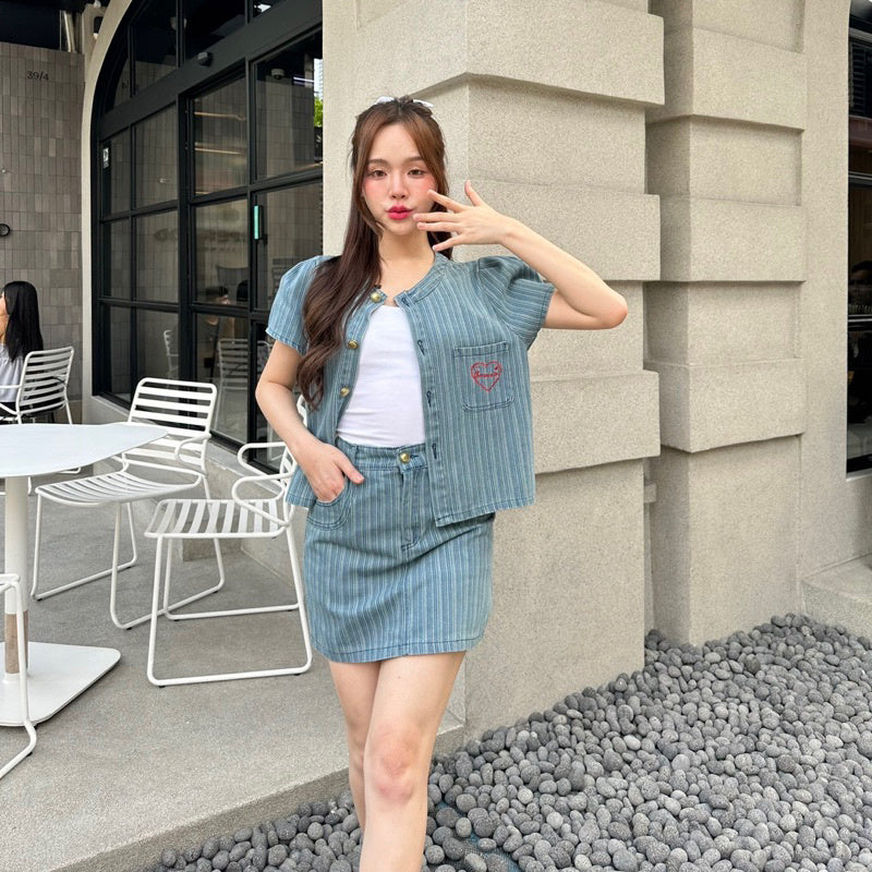 Get ready to turn heads with our Jean Set - a perfect 2 piece outfit featuring a doll sleeve t-shirt and short skirt. The high waist and heart-embroidered pockets add a touch of cuteness to this set. Made with good quality stretchy fabric, you'll be stylish and comfortable all day long.