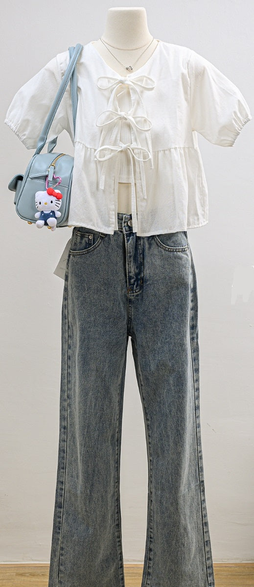 Introducing our Jelly Fish Blouse! This minimalist blouse features a front slit and a self-tying bow for a touch of playful elegance. Pair it with jeans and canvas shoes for a cute and quirky look. Don't worry about being too revealing - simply add a white tank top for a Korean girl inspired outfit.