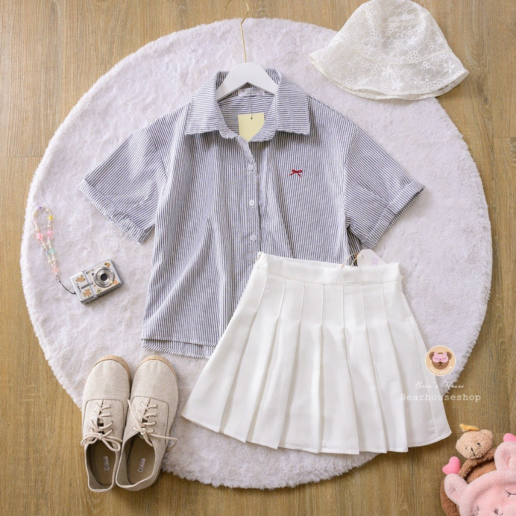 The Lilia Bowly Shirt is the perfect combination of cute and practical! This short-sleeved, collared shirt features a playful embroidered mini bow and functional buttons. The folded and sewn sleeve details and back pleats add a stylish touch. Versatile and easy to pair with skirts or pants, it's perfect for both travel and work. ❤️