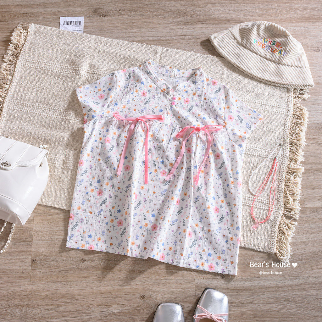 The Migule Blouse is the perfect blend of style and comfort. Its collar and short sleeves give it a unique look, while the loose fit adds a touch of ease. The 2 rubber pull buttons make it easy to wear and the sweet coloured velvet ribbons add a cute touch. This blouse is perfect for any occasion, whether it be travelling or heading to work.