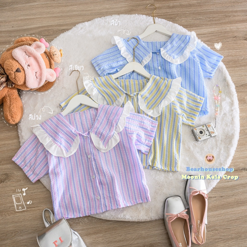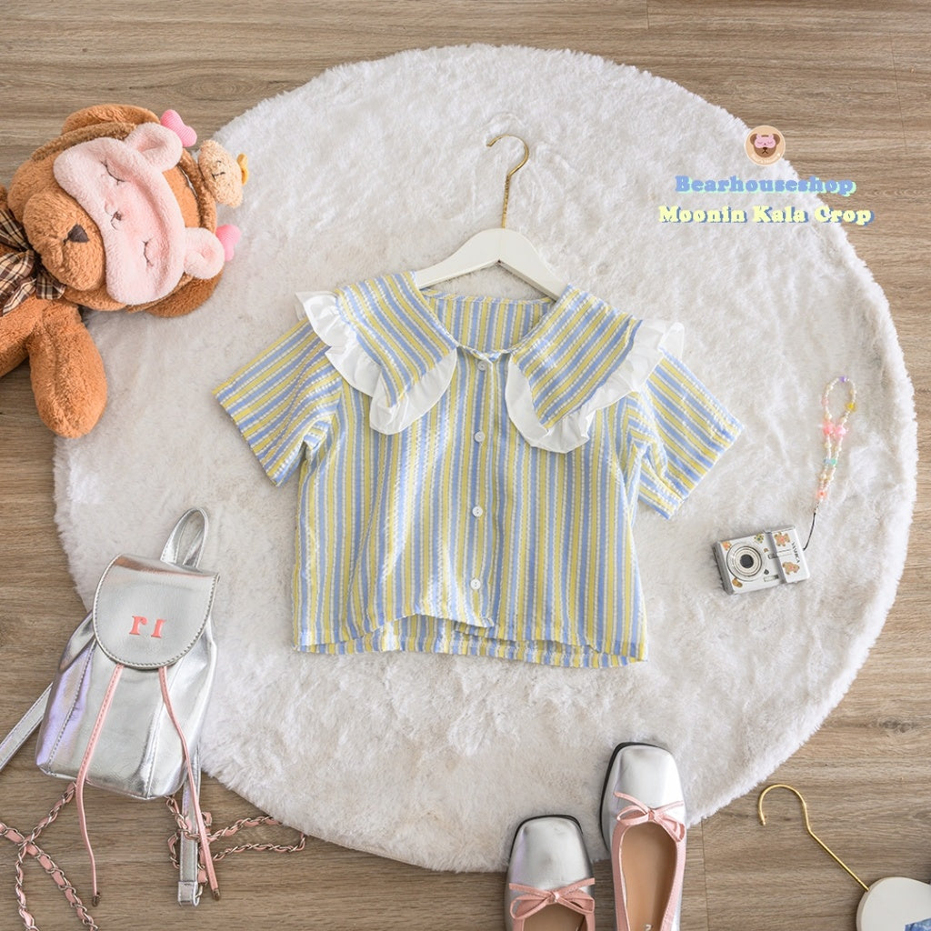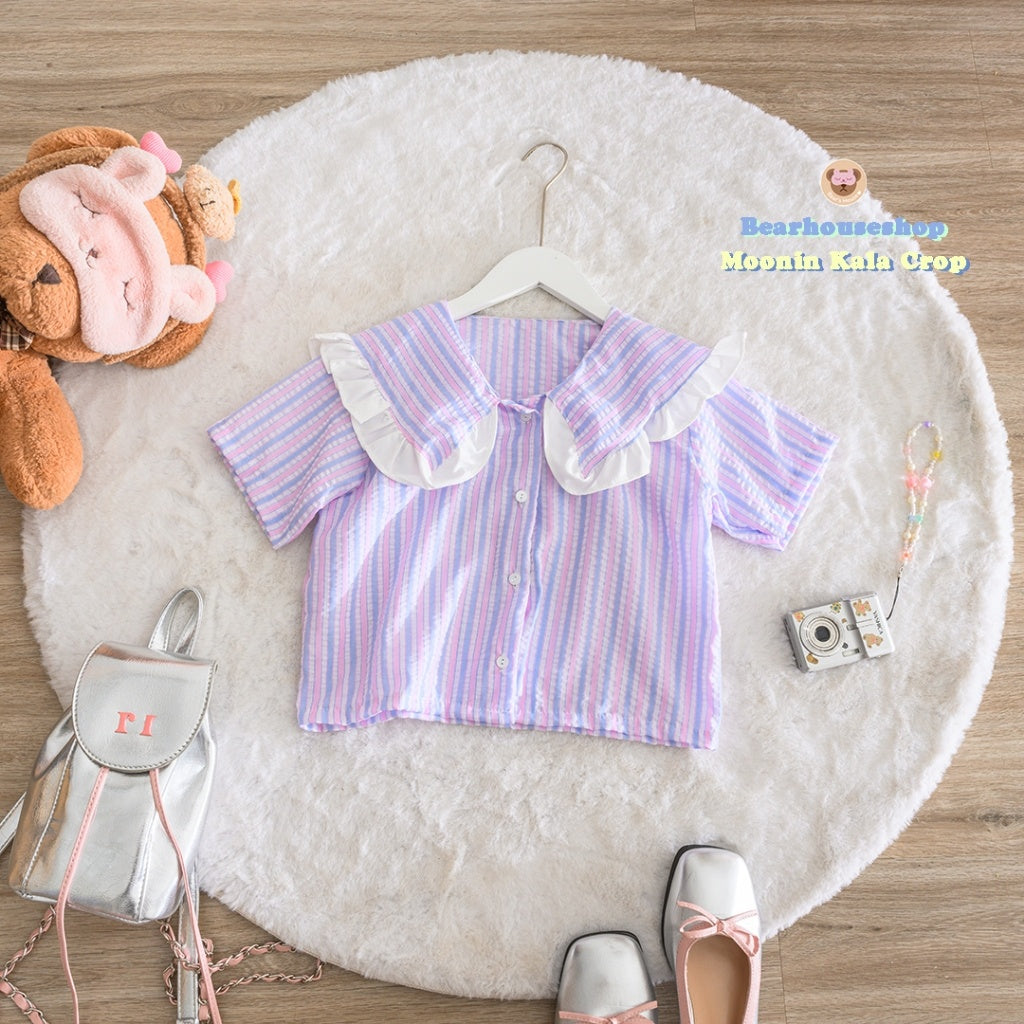Make a statement with the Moonin Kala Crop. This bowler collar shirt is decorated with ruffles and striped fabric, adding a touch of playfulness to any outfit. The pastel colours and beautiful work make it both stylish and cute. Mix and match with any skirt or pants for a unique and fun look.