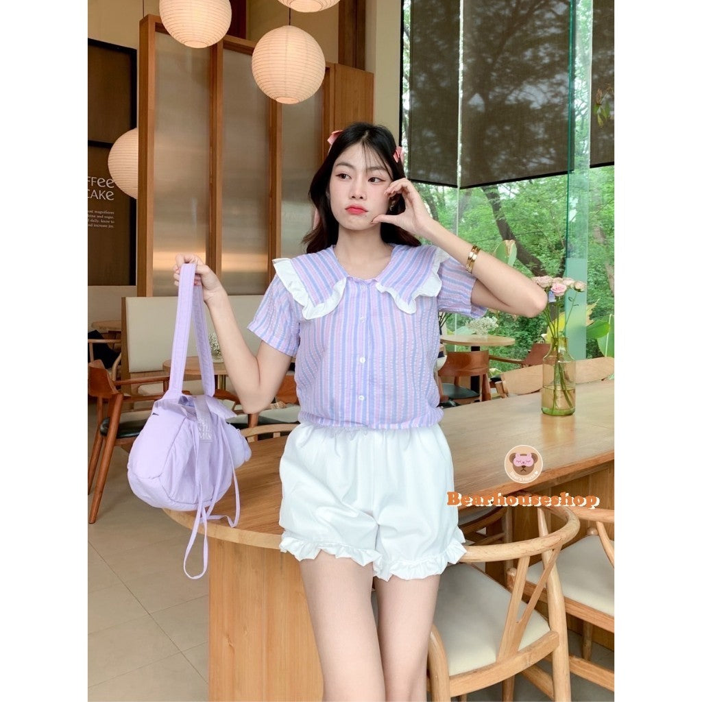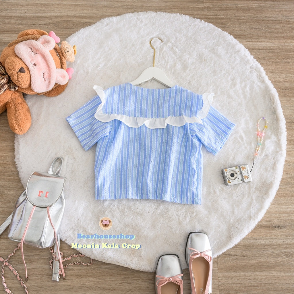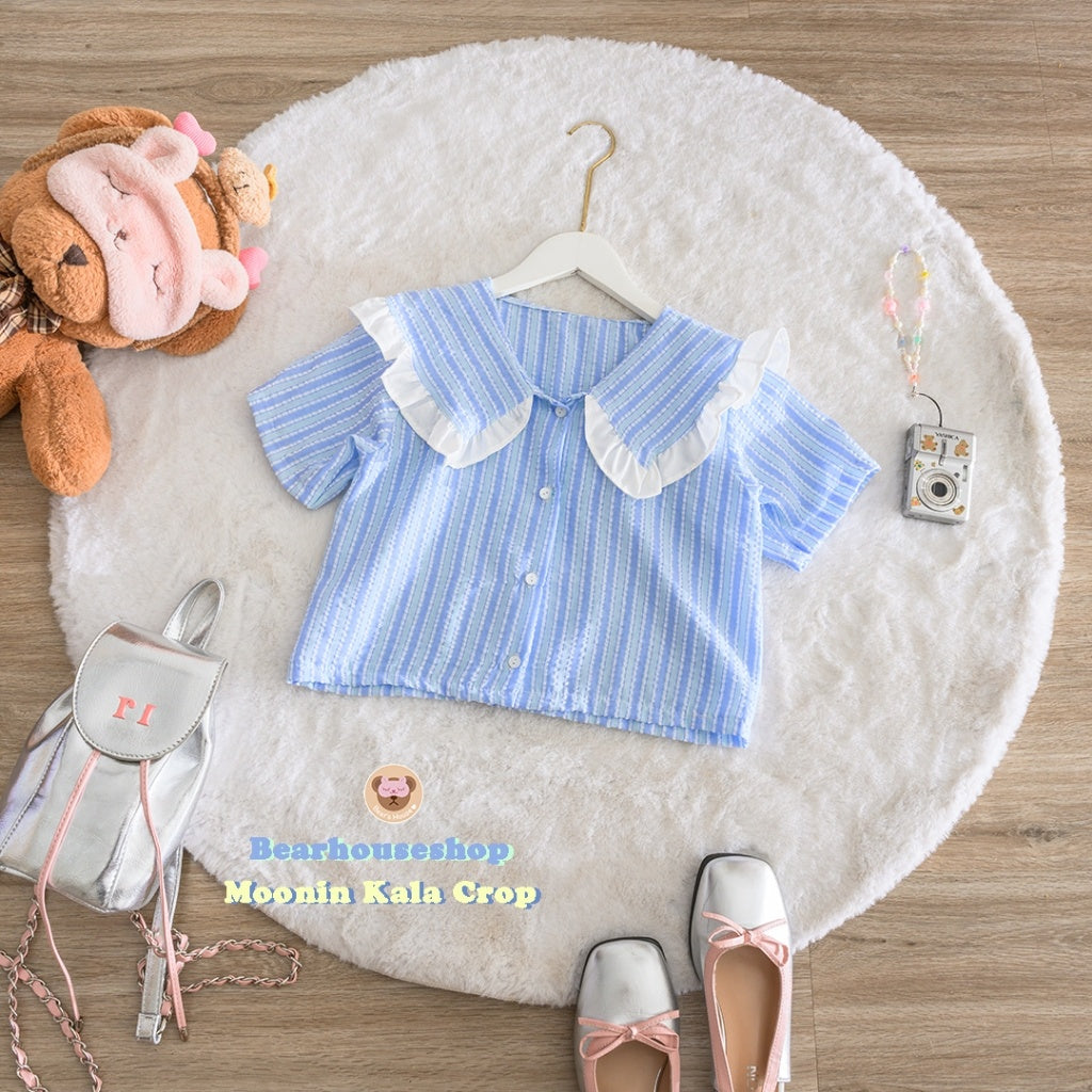 Make a statement with the Moonin Kala Crop. This bowler collar shirt is decorated with ruffles and striped fabric, adding a touch of playfulness to any outfit. The pastel colours and beautiful work make it both stylish and cute. Mix and match with any skirt or pants for a unique and fun look.