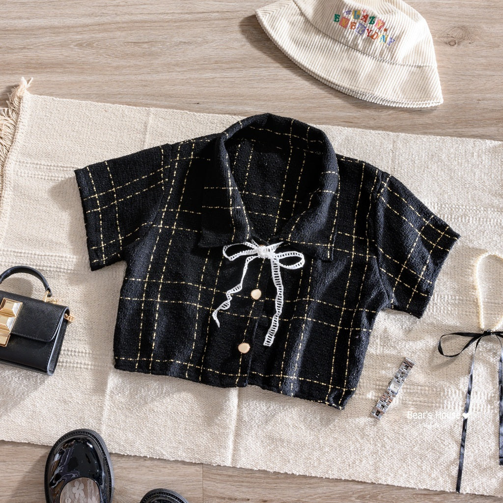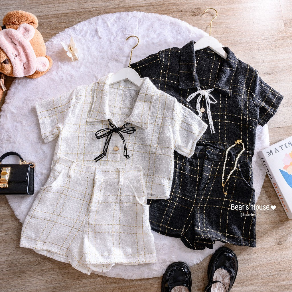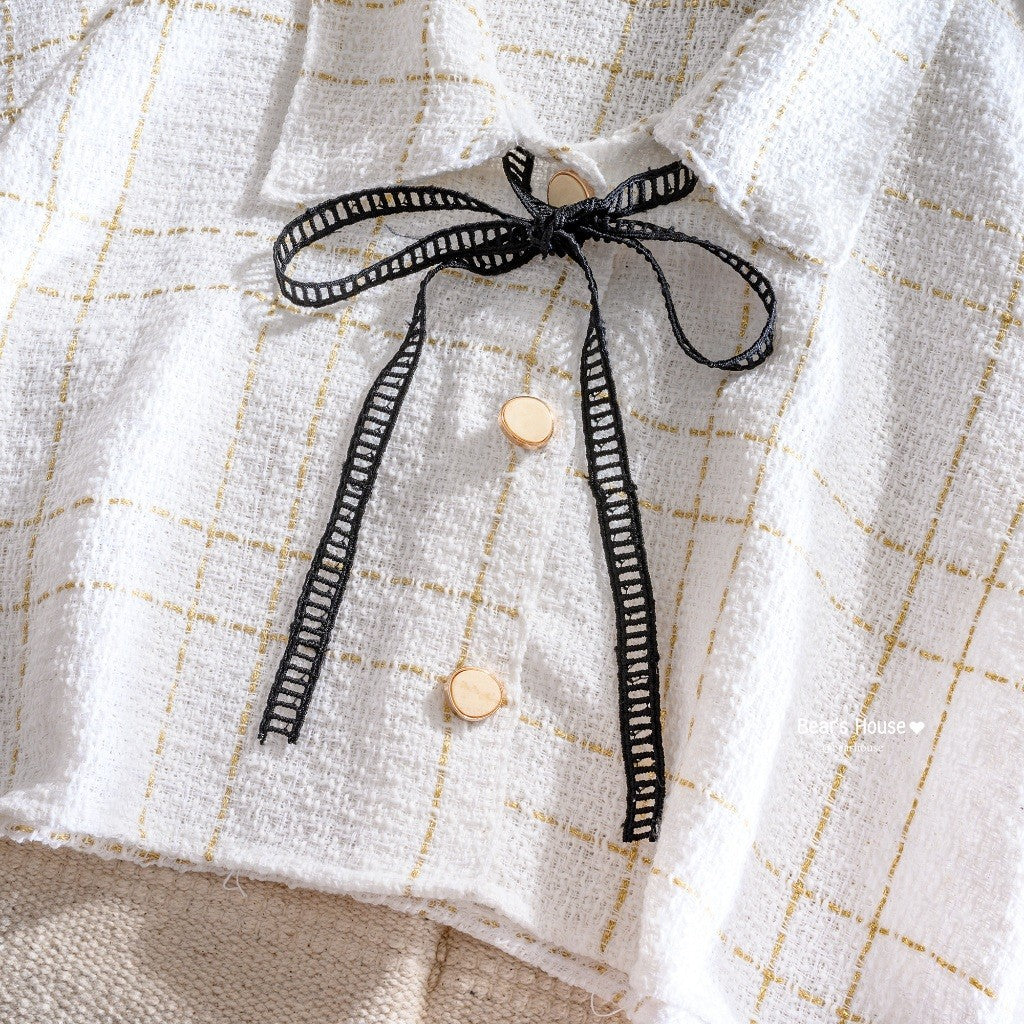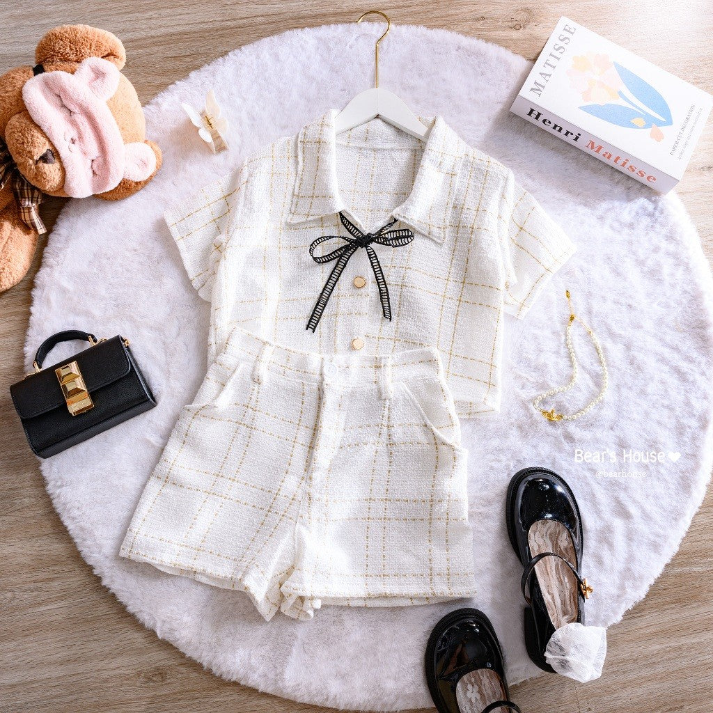 Get a fresh and flirty look with the Polly Tweet Top and Gigi Shorts set. This stylish shirt features short sleeves, a front tie bow, and soft tweed fabric that's cute and comfortable. Perfect for any occasion, from a day out with friends to a day at the office. No itch, just love! ❤️