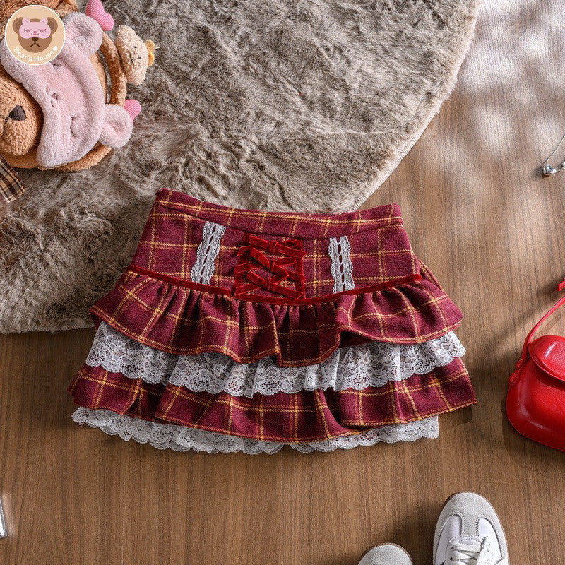 Santa Skirt กระโปรงลายสก็อต เเต่งระบาย2ชั้น งานป้าย ดีเทลเเต่งริบบิ้นช่วงเอว มีซับในเป็นกางเกง