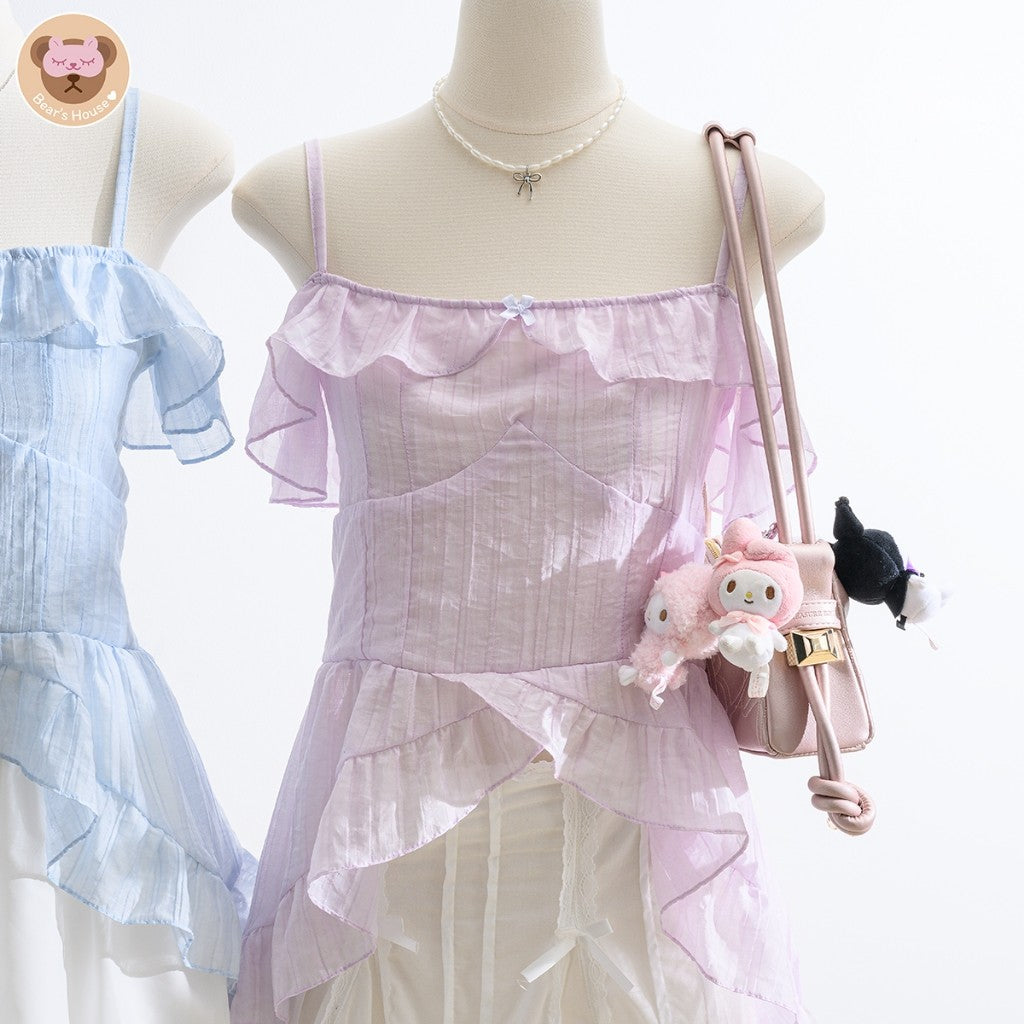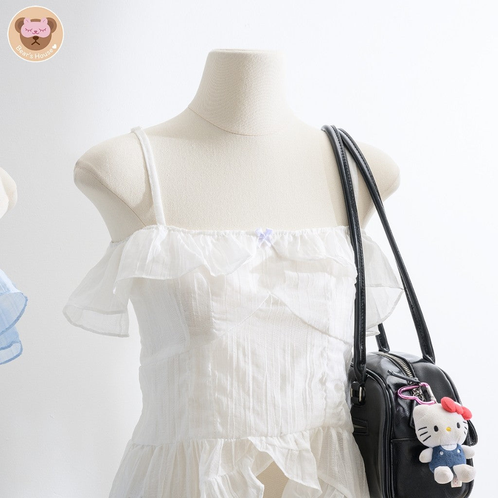 ปาดไหล่ ช่วงอกเเต่งระบาย ติดโบว์