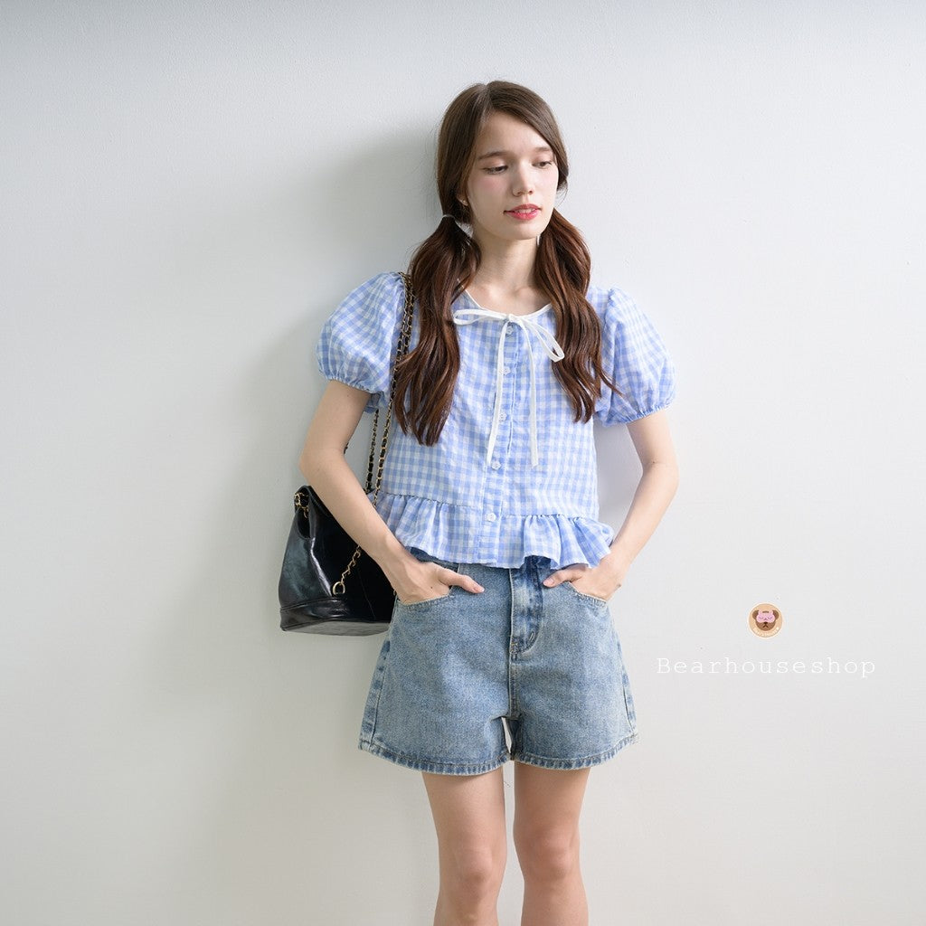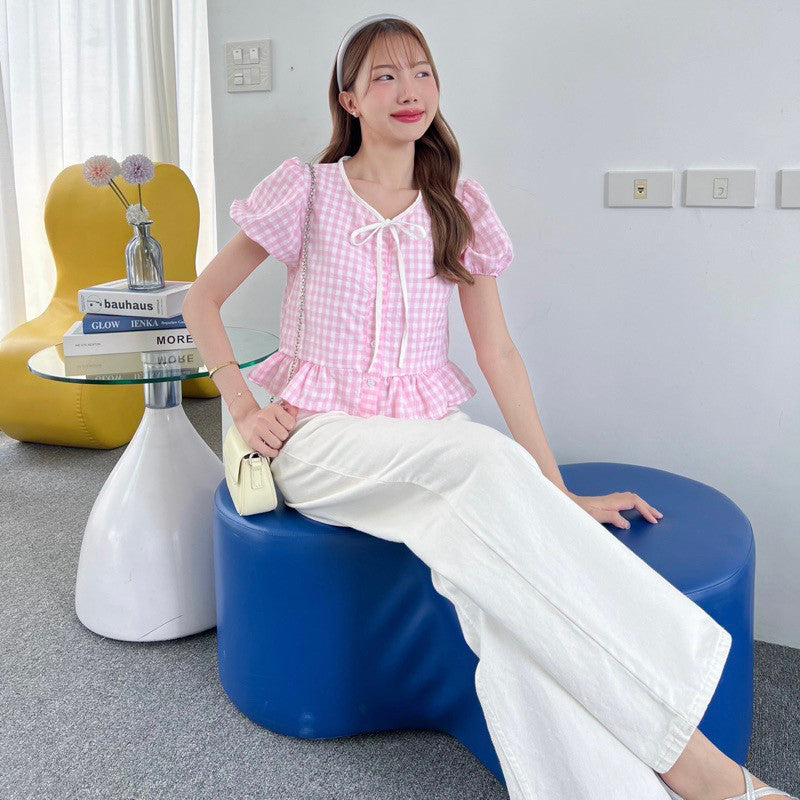 Add some playful charm to your wardrobe with the Sunday Scotte plaid doll-sleeve shirt. This quirky top features a working front button closure and a white bow cut, making it both functional and stylish. Plus, the chest is fully lined, making it comfortable and cute.