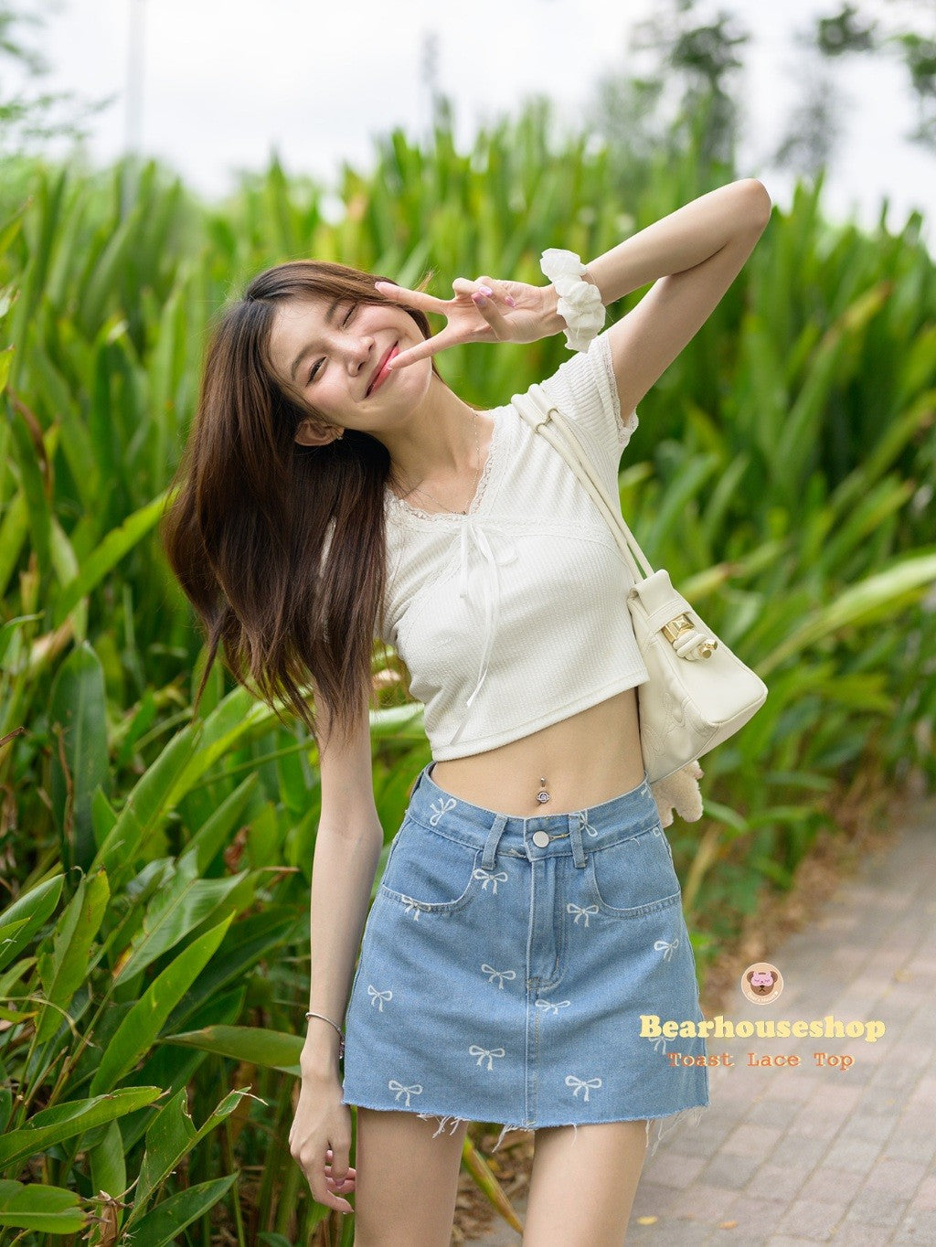 Cute and comfortable, this stretchy Toast Lace Crop is playfully adorned with lace edges and a ribbon. Its basic style gives off a clean and beautiful mood, perfect for those who don't take themselves too seriously. Keep it simple, keep it fun.