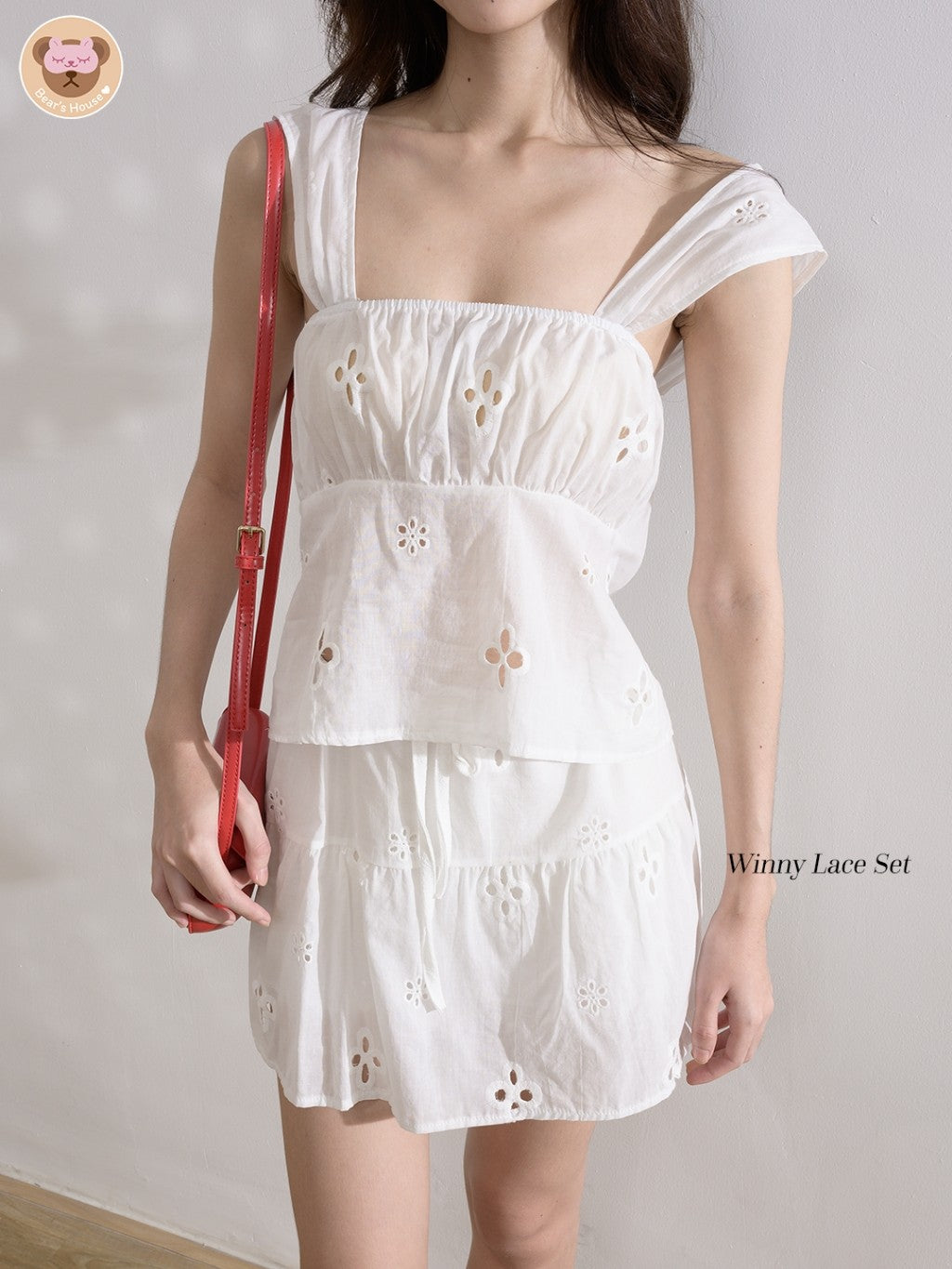 Winny Lace Set 2 ชิ้น เสื้อเเขนกุด+กระโปรงลูกไม้ฉลุ มีซับในทั้งตัว กระโปรงมีซับในเป็นกางเกง